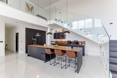 🔹 Kitchen: central island, 5 chairs, oven, microwave, toaster, dishwasher, coffee machine, kettle, refrigerator