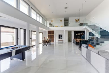 🔹Living room: table, 8 chairs, foosball table, pool table, sofa, and TV