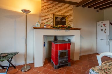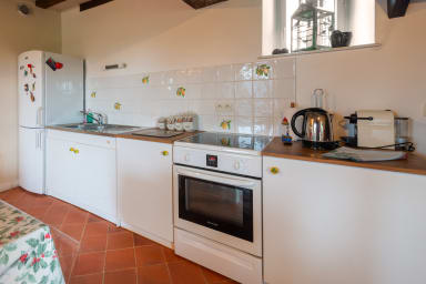 🔹 Kitchen: refrigerator, freezer, oven, induction hob, Nespresso coffee machine, kettle, toaster, wood-burning stove, table with 6 chairs