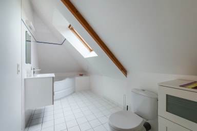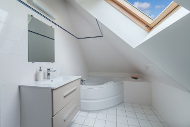 🔹 Bathroom: corner bath, WC, storage space, hairdryer