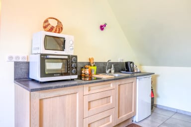 🔹Open-plan kitchen: Table with five chairs, microwave, oven, two induction hobs, refrigerator, kettle.
