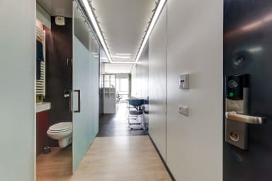 The main room offers a comfortable single bed (120x190 cm) and a functional workspace with a desk and storage space to help you organise your days or work remotely efficiently. The open-plan kitchen, equipped with a refrigerator, microwave, induction hob, kettle and Dolce Gusto coffee machine, as well as a table with two chairs, allows you to prepare your meals independently. The modern bathroom, with shower, sink, toilet and storage space, completes the comfort of the accommodation and makes your daily life easier.