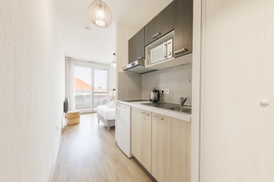 Upon arrival at this 19 m² studio, you will find yourself immersed in a functional cocoon where every space is optimised for your comfort. The 120x200 cm bed promises restful nights, while the desk provides an ideal space for working or organising your visits. The kitchen, equipped with a refrigerator, coffee machine, kettle and microwave, makes it easy to prepare your meals. The bathroom with shower and toilet completes the layout, and the included bed linen and towels make your stay immediate and pleasant. You can also enjoy a pleasant 10 m² balcony, ideal for al fresco dining or relaxing.