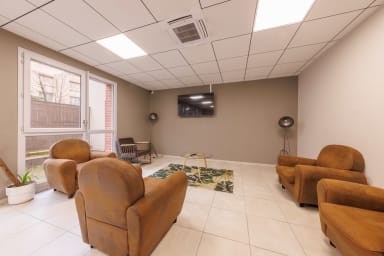 Outside, you can enjoy a bright communal area to get some fresh air or relax after a busy day. Free street parking adds to the convenience of the location, making it easy to get around.
