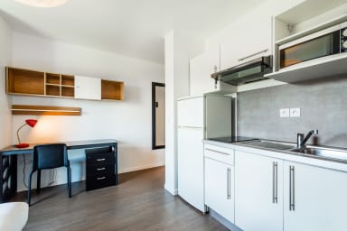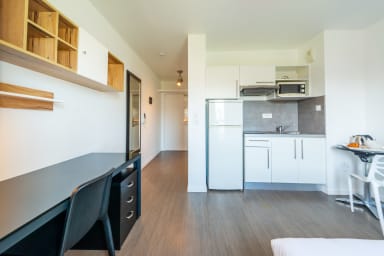 This 21 m² studio is designed to accommodate one person in a simple and pleasant environment. The living area has a single bed, ideal for resting after a day of work or classes, a dining area with a table and chair, perfect for enjoying a meal, and a desk for working in peace. The atmosphere is functional and reassuring, designed for both short and extended stays.