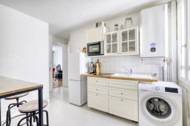 🔹Cuisine fermée avec four, réfrigérateur, machine à café, machine à piston, machine à laver, table et deux tabourets
