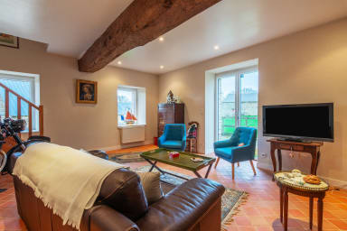 🔹 Salon : canapé, fauteuils, TV, jeux de société