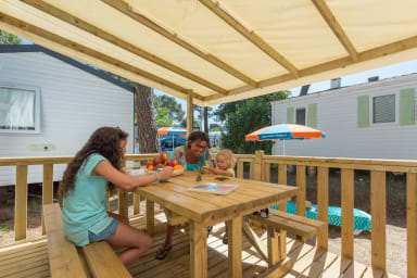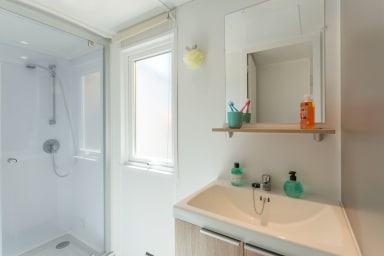 À l’extérieur, la terrasse privative prolonge naturellement l’espace de vie, parfaite pour prendre les repas, se détendre ou profiter du cadre verdoyant du camping. Les animaux sont acceptés, et de nombreux équipements pratiques complètent le séjour : cintres, détecteurs de fumée et de monoxyde de carbone, entrée bien éclairée, ainsi qu’un accès à la laverie automatique du camping.