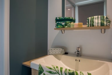 Le logement comprend une salle de douche, pratique pour un usage quotidien. À l’extérieur, un patio privatif permet de profiter de moments agréables en plein air. L’entrée est bien éclairée, facilitant les arrivées à toute heure, et une laverie automatique est accessible au sein du camping.