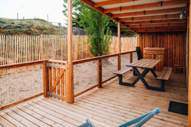 Côté sanitaires, vous bénéficiez de deux salles de douche, pratiques pour les séjours à plusieurs. À l’extérieur, un patio privatif et un barbecue permettent de profiter des repas et moments de détente en plein air. L’accès à l’entrée est bien éclairé et une laverie automatique est accessible au sein du camping.