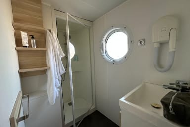 La salle de douche est fonctionnelle et adaptée à un usage quotidien. À l’extérieur, vous profitez d’un patio privatif, parfait pour prendre les repas ou se détendre après une journée d’activités. L’accès bien éclairé facilite les arrivées, y compris en soirée, et une laverie automatique est disponible sur le site.