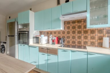 🔹Cuisine : Four, réfrigérateur, micro-ondes, grille-pain, bouilloire, machine à café Bosch, table, 2 chaises, lave-linge