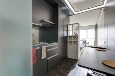 La pièce principale offre un lit simple confortable (120x190 cm), un espace de travail fonctionnel avec bureau et rangements pour organiser vos journées ou télétravailler efficacement. La cuisine ouverte, équipée de réfrigérateur, micro-ondes, plaque induction, bouilloire et machine à café Dolce Gusto, ainsi qu’une table avec deux chaises, vous permet de préparer vos repas en toute autonomie. La salle d’eau moderne, avec douche, vasque, WC et espace de rangement, complète le confort du logement et facilite votre quotidien.