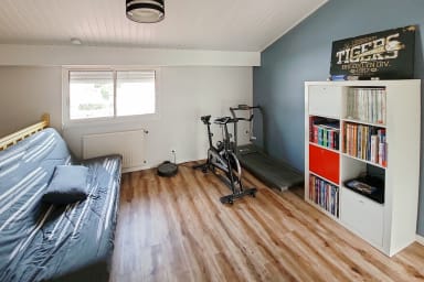 🔹 Salle de jeux : canapé-lit double, livres, tapis de course et vélo d’appartement