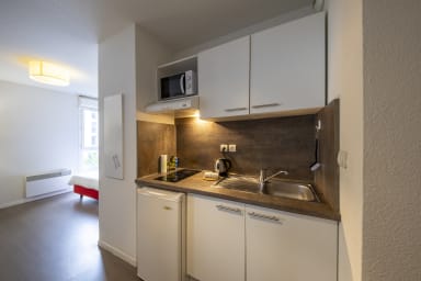 Le coin cuisine met à disposition l’essentiel pour vos repas du quotidien, avec réfrigérateur, micro-ondes, machine à café et bouilloire. La salle d’eau, équipée d’une douche, d’une vasque et de WC, complète l’ensemble avec praticité, tandis que le linge de lit, le linge de bain et les consommables sont inclus.