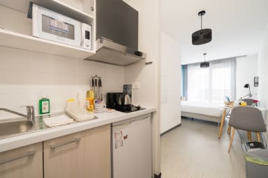 La résidence dispose de parties communes pratiques, incluant une laverie en libre-service (service payant) ainsi qu’une salle de sport accessible aux résidents. À l’extérieur, le studio bénéficie d’un stationnement dans la rue gratuit.