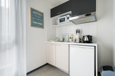 La kitchenette dispose d’un réfrigérateur, d’un four micro-ondes et d’une bouilloire, permettant de gérer vos repas et petits-déjeuners en toute autonomie. Vous avez également à disposition une salle d’eau avec douche et WC. Le linge de lit et de bain est fourni et tous les consommables nécessaires sont présents pour que vous puissiez voyager léger et profiter pleinement de votre séjour.