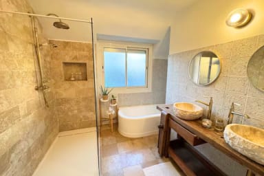 - Salle de bain avec une douche, une baignoire et deux vasques. Sèche cheveux à disposition