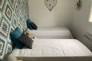 Le studio accolé, en duplex, propose un espace indépendant, avec deux lits simples, une télévision et un cabinet de toilette. Cette indépendance permet à chacun de trouver son rythme tout en restant connecté à la maison principale.