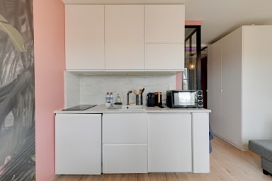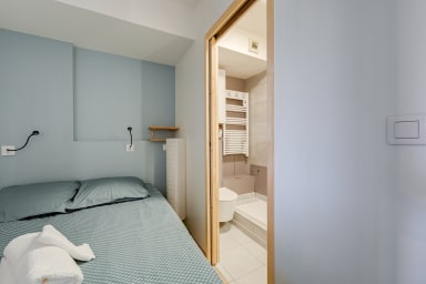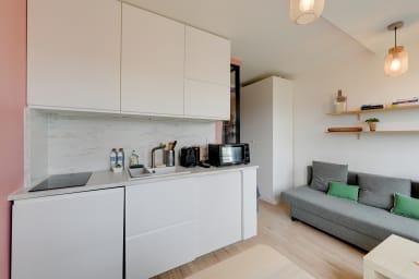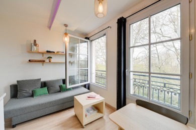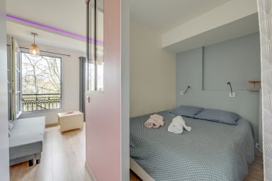 À l’intérieur, le studio de 22 m² sépare harmonieusement la chambre du salon par une verrière et un rideau. Le lit double confortable (140 x 190 cm) est équipé de liseuses et de prises USB pour un sommeil et un confort connectés. Le salon lumineux, avec canapé et table pouvant servir de bureau, offre une vue directe sur la Marne et un éclairage LED modulable pour créer l’ambiance idéale. La cuisine compacte mais complète comprend plaque à induction, mini-four, réfrigérateur, machine à café Nespresso, bouilloire et lave-linge séchant. La salle d’eau moderne dispose d’une douche à l’italienne, d’un sèche-serviettes, de rangements et de WC.