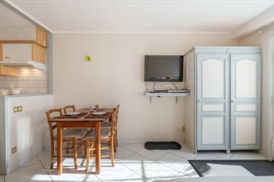 Installez-vous dans Le Nid Vosgien, un charmant studio de 23 m² pensé pour un séjour paisible en couple ou en solo. La pièce principale accueille un lit double de 140x200 cm, une table à manger avec quatre chaises, un petit coin TV et de nombreux rangements. La cuisine est équipée pour préparer vos repas : plaque de cuisson, four, micro-ondes, réfrigérateur, bouilloire et cafetière à filtres. La salle de bain comprend douche, WC, lavabo et rangement pratique.